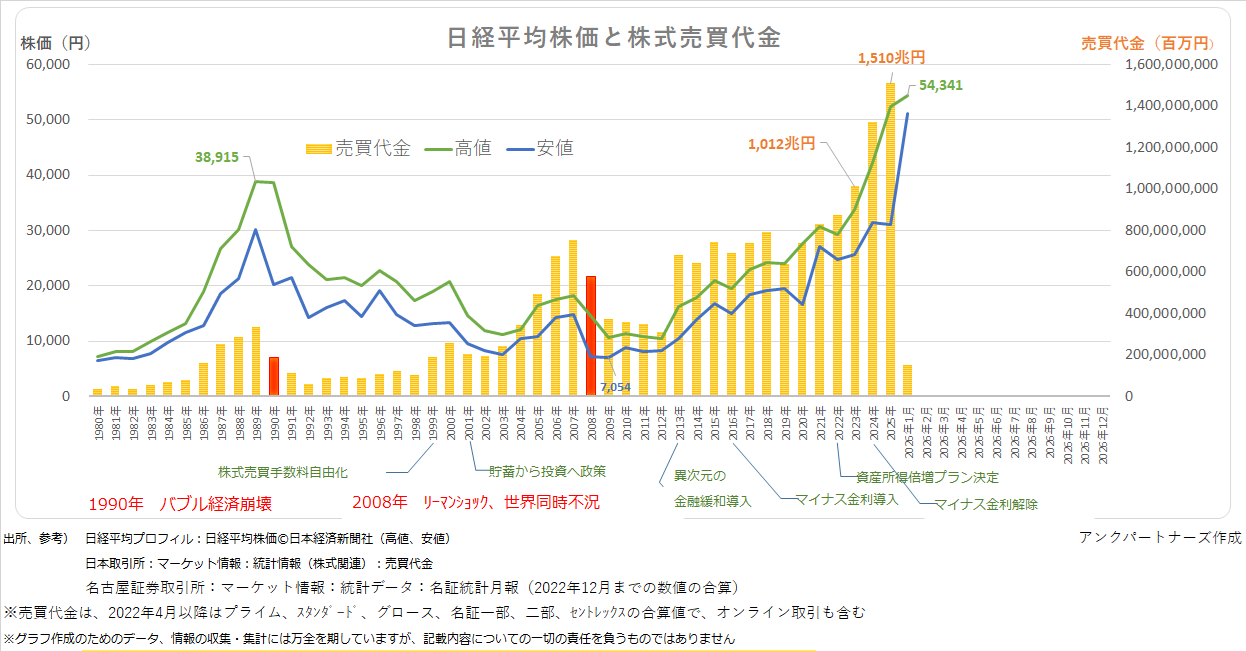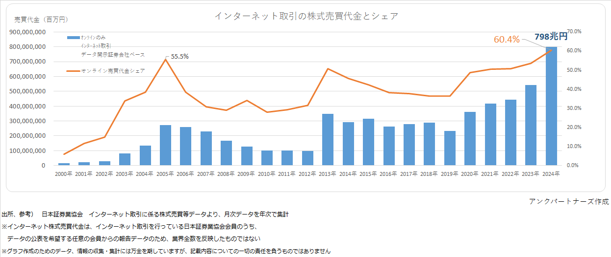 株価と売買代金&ネット取引シェア マーケットデータ 2021.10.082026.02.27 2025年の年間株式売買代金は1,510兆円の過去最大に 2024年2月には、バブル期の株価最高値を更新。2026年1月には5.4万円超を記録 ネット取引の2024年の年間株式売買代金は798兆円。60.4%のシェアを占める(集計は2024年まで)