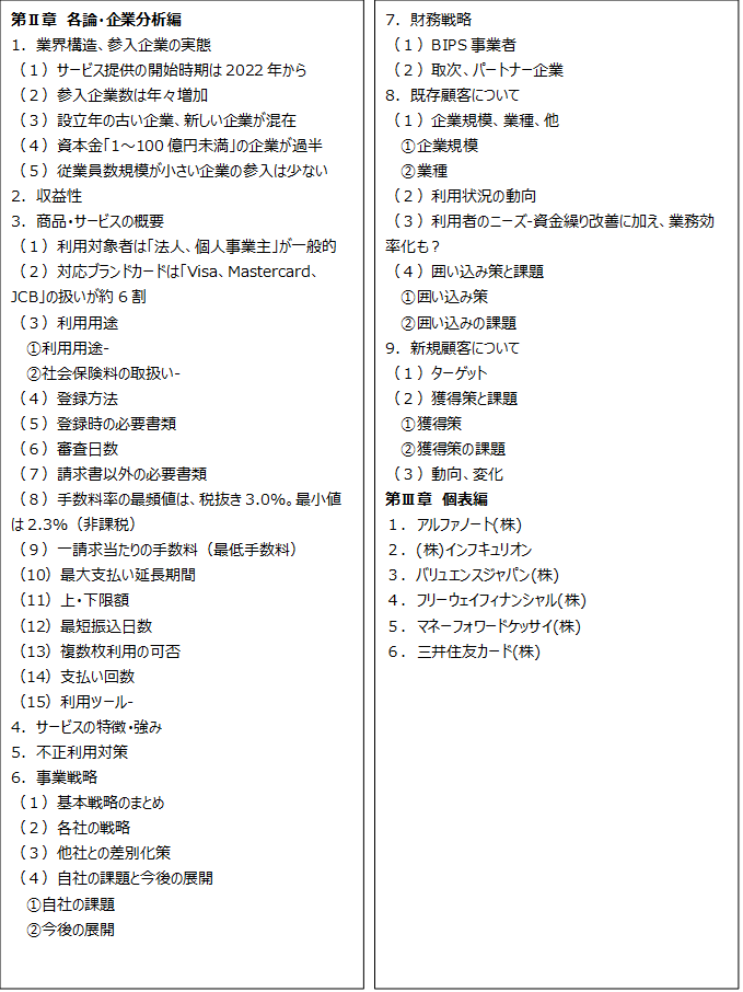 ■BIPS事業者(請求書カード払い事業者)、金融機関、決済事業者、ERP事業者などの取次・パートナー企業など、今後の事業戦略立案に必要な情報を網羅した、業界唯一の総合レポートです。